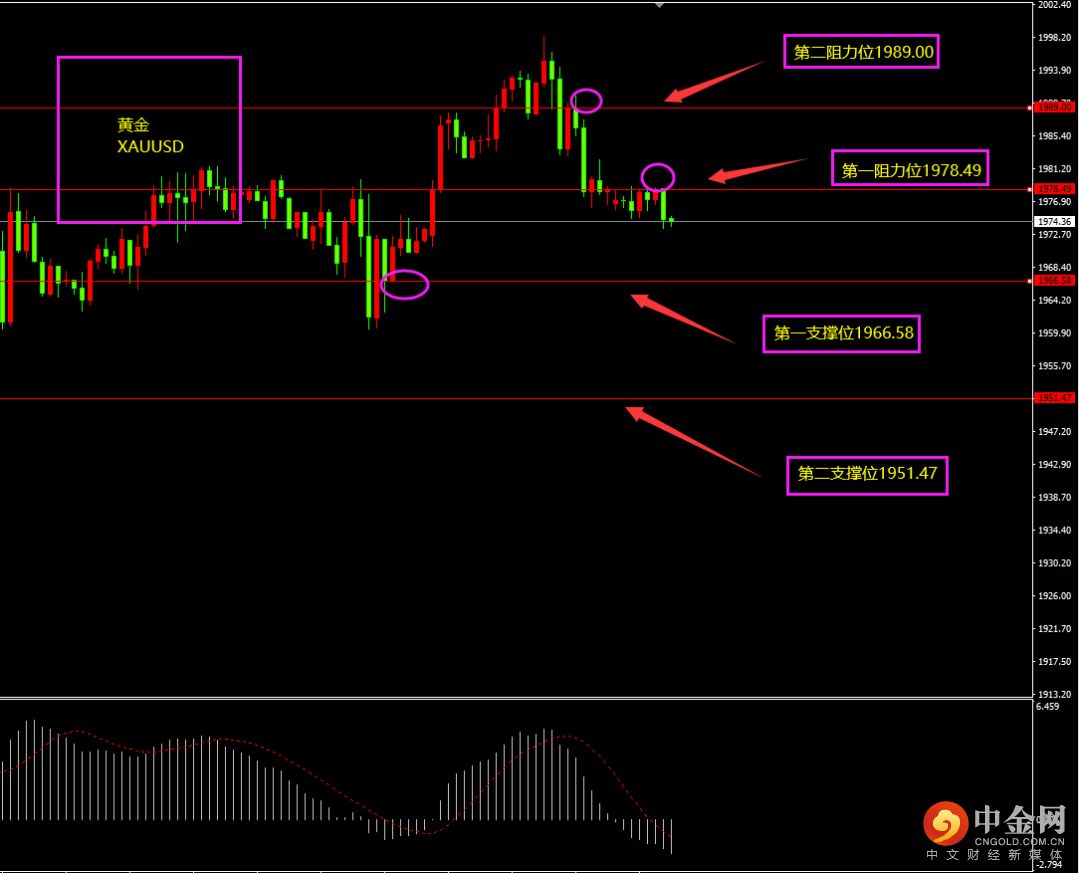 天图黄金收小阳线,上影线较长,价格一度冲高后大幅下滑,多头遭受空头反扑,短期实体部分较小,多头不强,日内更多以逢高看空为主。小时图黄金期间连续阴线回落,MACD位于0轴之下,空头占优,短期底部无大阳线立足,多头不强,日内更多以逢高看空为主。