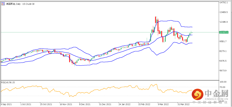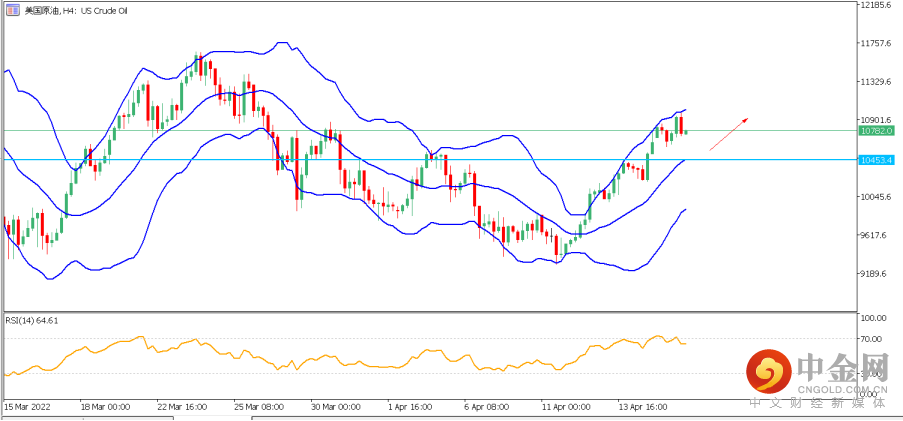 再结合4小时分图,日内布林带中轨104.50视为关键看涨支撑,若价格稳于该位上方,则保持看涨,潜在目标可分别为110.00及113.00附近。若价格跌破104.50支撑,则短期可能再次回测101.00。基本面俄乌局势依旧发酵中,该局势的后续发展对美油起到关键走势推动作用,投资者应密切关注该局势的新进展。