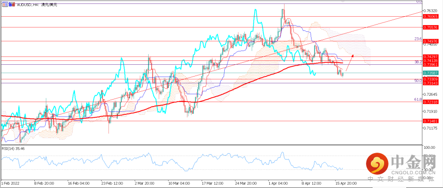 2.澳元/美元(AUDUSD):澳元近期在4月5日触及0.7660附近的高点后不段走弱。一方面,在美澳两国之间利差不断拉大的情况下,美元强劲上涨势头给澳元的多头带来了一定的压力。另一方面,在本周一中国公布了不理想的3月经济数据后,市场在短期内适度调低了澳大利亚未来从最大贸易伙伴中国获取的贸易盈余预期,进一步削减了市场对于澳元的需求。