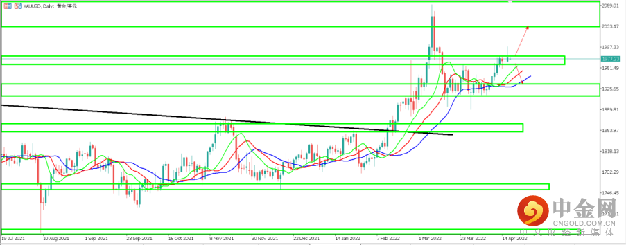 3. 黄金兑美元(XAUUSD):黄金昨日上涨后被压制,盘中一度触及高点1998美元接近2000美元整数关口位置,收盘后价格承压收在1978美元附近。从天图周期来看,目前鳄鱼指标3条均线呈现多头排列,价格近2周也持续上涨。天图重要阻力区间位于1980附近,如价格能够成功站上该区间,则有望打开通往2000整数关口的空间。反之如价格无法有效突破1980一线,则可能回调至1920一线寻找支撑。从4小时周期来看,目前黄金正处于上行通道中运行,鳄鱼指标多头排列明显,如上涨趋势延续,则价格将率先测试2005一线阻力。反之如价格跌破鳄鱼指标慢线,则可能回调天图支撑1920一线。目前价格正位于1975一线附近运行。