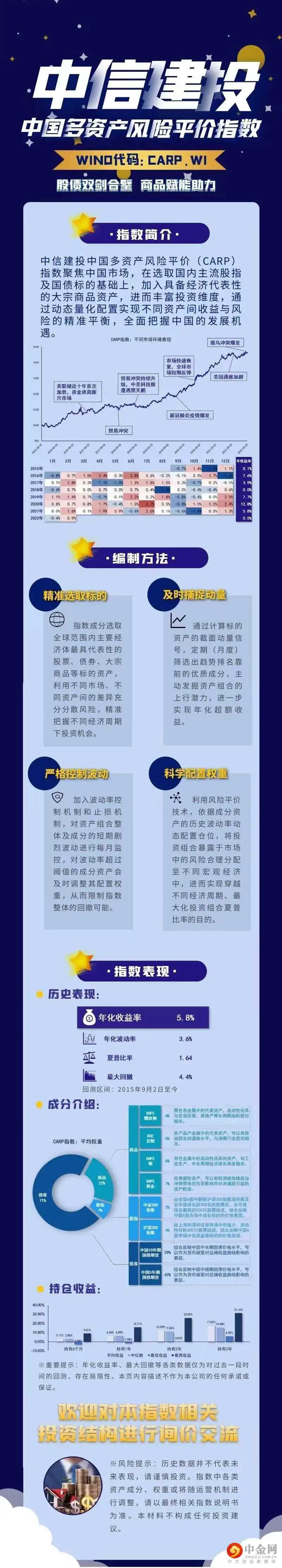 CARP(万得代码:CARP.WI)是Chinese Assets Risk Parity首字母的缩写,是中信建投证券编制的中国多资产风险平价指数。