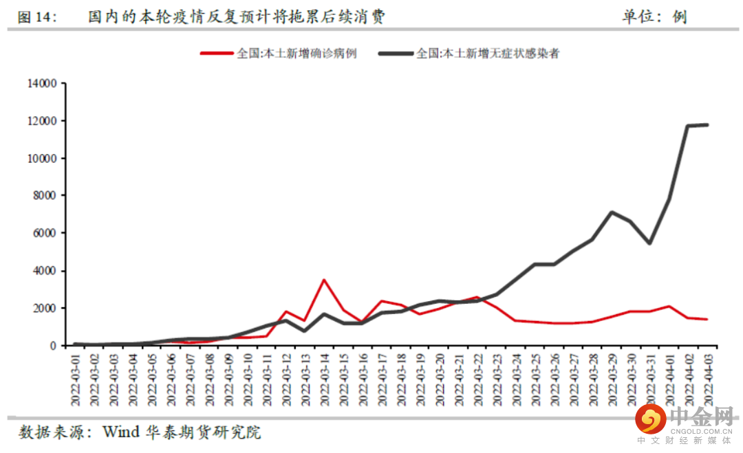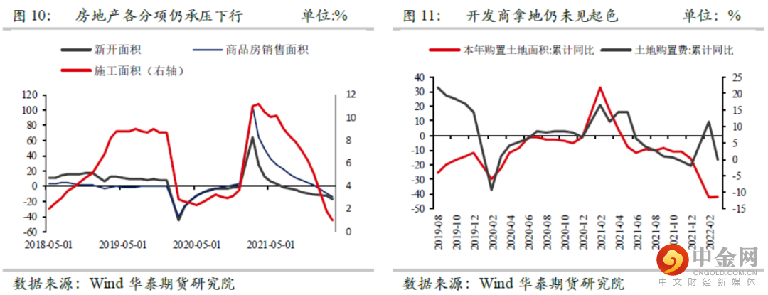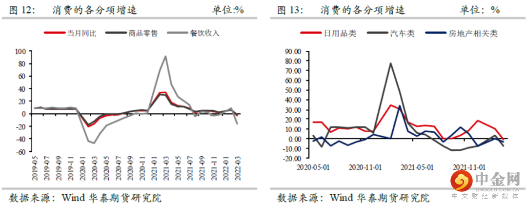 疫情反复下,消费明显放缓。3月社会消费品零售总额当月同比增长-3.5%,较6.7%的前值大幅放缓,其中3月的餐饮收入和商品零售当月同比分别为-16.4%和-2.2%,1-3月网上商品和服务零售总额累计同比增长6.6%,前值为10.2%。受国内疫情反复影响,居民收入和就业明显承压,2022年一季度城镇居民人均可支配收入累计同比增长5.4%,前值为8.2%。3月的城镇调查失业率和31个大城市调查失业率分别录得5.8%、6%,前值分别为5.5%、5.4%,均较前值有明显上升,消费端的长期驱动力进一步削弱。