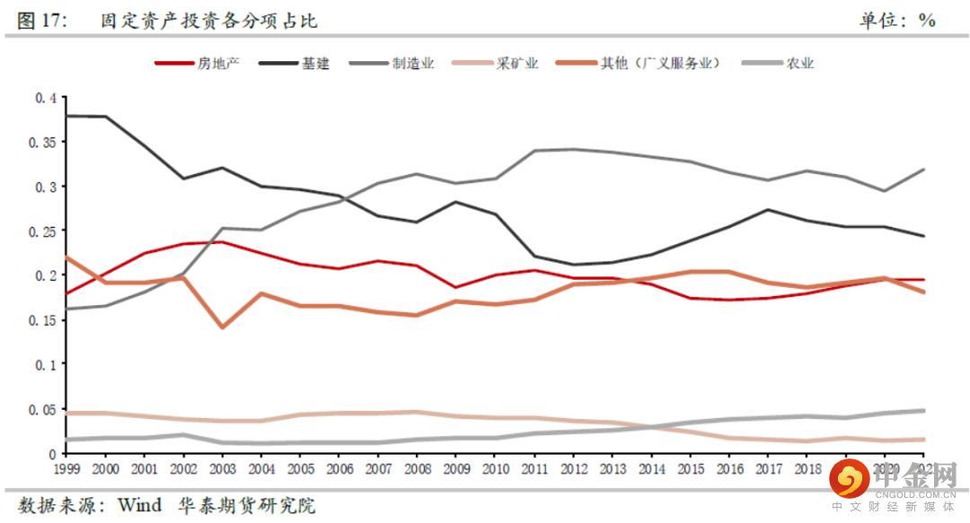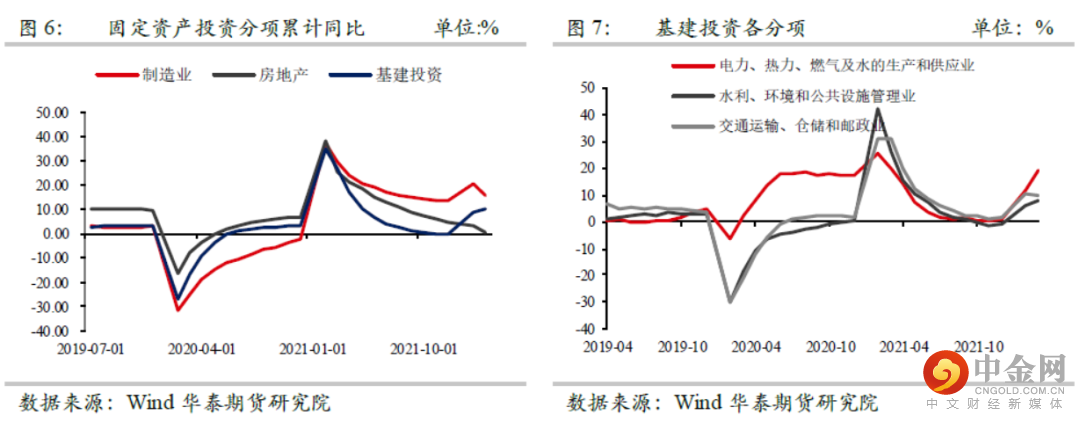 两会确立GDP增速目标5.5%,当前经济仍表现疲软。从2022年1-3月经济数据来看,投资分项下的地产是拖累GDP的主要因素,2022年1-3月房地产和基建投资的累计同比增速分别为0.7%和10.5%。从支出法来看,GDP拉动可以拆解成消费、净出口和资本形成。2018年以来,固定资产投资增速持续低于实际GDP增速,在今年净出口承压回落,消费中性的判断下,固定资产投资至少要持平甚至略高于GDP实际增速。固定资产投资拆解来看,2021年制造业投资占比31.8%,房地产投资占比19.4%,基建占比24.3%,农业占比4.7%,采矿业占比1.5%,其余部分(广义服务业)占比18%左右。假设今年其他行业维持近5年复合增速(农业9.4%、采矿业4.6%、制造业5%,广义服务业5%),粗略推算下,在5.5%的固定资产投资增速对应基建10.4%、地产5%的增速,6.6%的固投增速对应基建12.7%、地产7%的增速。需要指出的是,支出法下资本形成分项和固定资产投资的统计口径存在明显差异,该测算结果仅供参考。