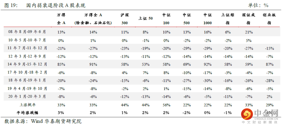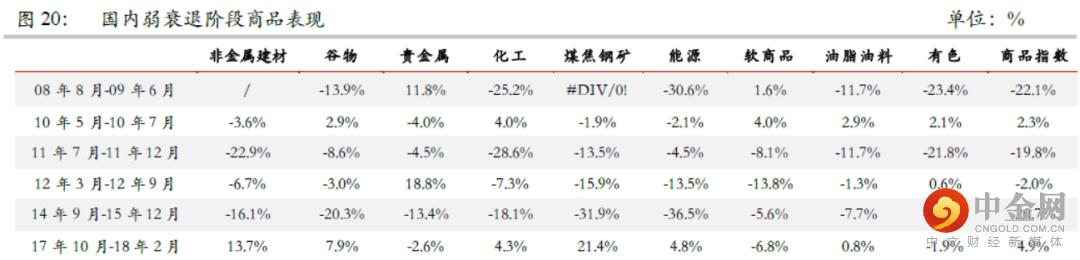 “弱衰退”阶段下,国内股指表现弱势,而商品中的能源、非金属建材表现最疲软,工业品整体偏弱。为了分析阶段内的大类资产表现,我们筛选PMI下行,PPI拐点向下或者下行趋势的阶段作为“弱衰退”的条件。通过分析历史上9个弱衰退的宏观情境,我们发现国内股指表现偏震荡,平均涨幅上中证500和上证综指录得下跌,其他指数尽管平均录得正涨幅,但样本的上涨概率普遍不及50%。