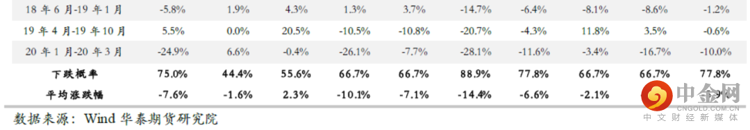 商品方面,能源表现最弱,录得14.4%的平均跌幅,88.9%的样本录得下跌,此外,软商品、非金属建材甚至商品指数的下跌概率也高于70%。再次之是化工、油脂油料、焦煤钢矿、有色样本下跌概率在66%左右。