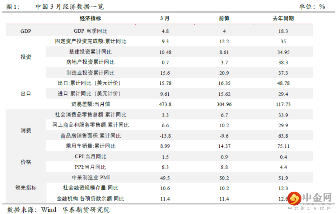 基建投资发力稳增长。在政府强调“适度超前开展基础设施建设”的指导下,基建投资三大分项增速显著回升,稳增长功能明显发力。1-3月电、热、燃气及水的生产和供应业,水利、环境和公共设施管理业较前值有所增长,分别为19.3%,8%;交通运输、仓储和邮政业累计同比增速9.6%,较10.5%的前值放缓。显示当下基建发力点更侧重于风电、光伏、能源等新基建,以及水利、环境等项目,有色板块受益相对明显。