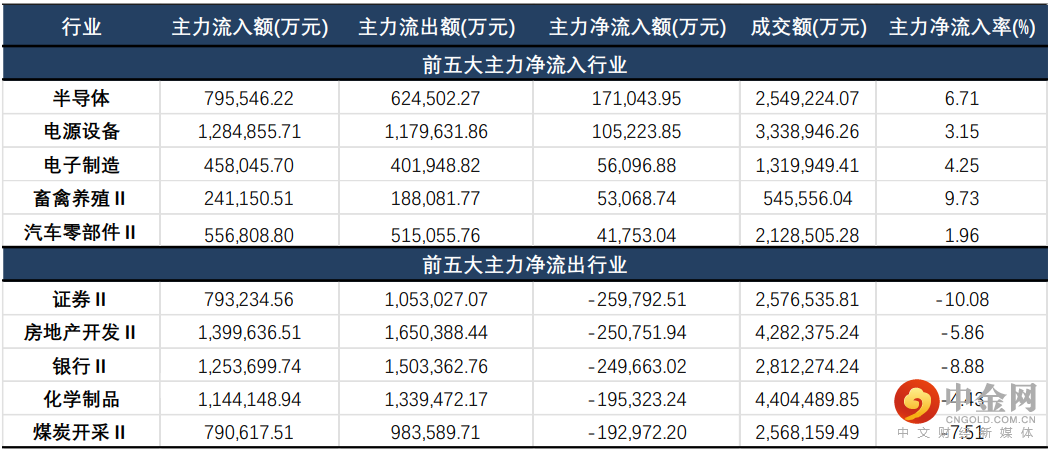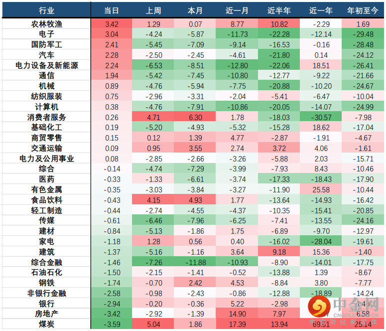 行业方面,当日涨幅前三的中信一级行业为:农林牧渔(3.42%)、电子(3.04%)、国防军工(3.04%);而跌幅前三的行业为:煤炭(3.59%)、房地产(3.42%)、银行(2.94%)。