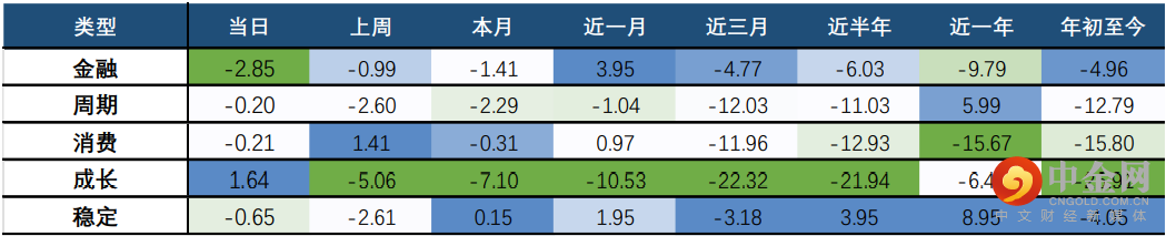 中信风格方面,金融风格回调明显,当日下跌2.85%;成长风格终现反弹,当日收涨1.64%;消费风格热度有所回落,当日收跌0.21%。