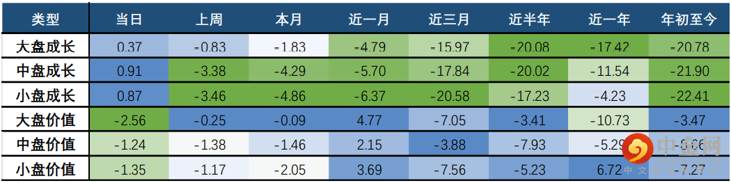巨潮风格方面,成长、价值风格反转,成长风格当日表现优于价值;其中中盘成长领涨,当日上涨0.91%;而大盘价值领跌,日内跌幅达2.56%。