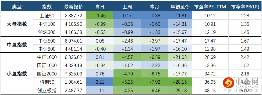 大、中、小盘指数方面,大盘指数与小盘指数表现分化,小盘指数表现相对较优;其中,上证50未能持续上周涨势,当日回调1.46%;而科创50当日出现反弹,当日收涨3.21%。