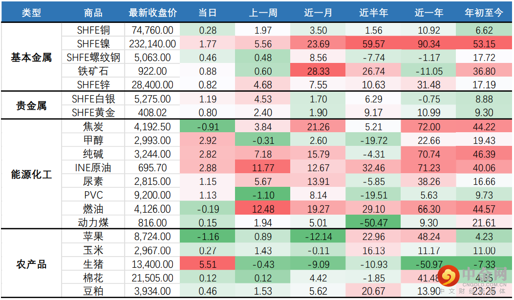 国内商品期货市场表现持续强劲,生猪合约反弹;基本金属多数收涨,SHFE镍上涨1.77%;贵金属持续上行,SHFE白银持续上涨,当日上涨1.19%,SHFE黄金涨0.80%;能化方面,甲醇、纯碱涨幅近2%;黑色系涨跌互现,铁矿石涨0.88%,螺纹钢涨0.46%,而焦煤焦炭走弱,分别下跌2.97%、0.91%;农产品方面,生猪当日大幅反弹,当日收涨5.51%;苹果收跌1.16%。
