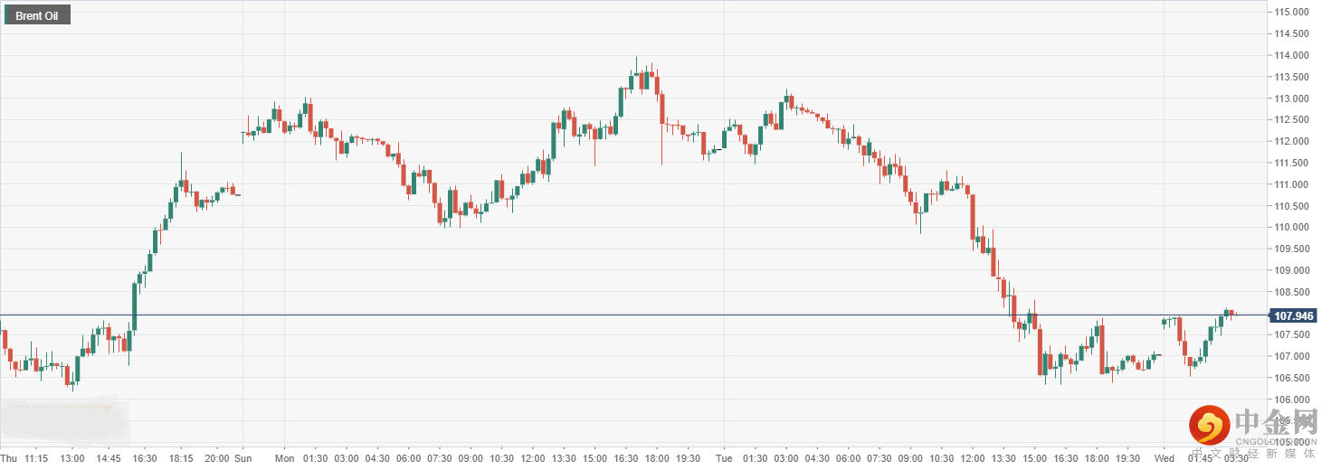 布伦特原油周二收盘大幅回落后,今日开盘跌近3%至107.94附近,因IMF下调经济增长预期引发需求担忧,导致油价下行震荡。