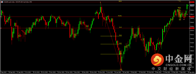澳大利亚东岸时间4月20日(周三),受澳洲大选以及美国三大股指高走高收利好影响,澳洲股指(AUS200)继续高开高走,于发稿时已经达到7,624点,进一步逼近2021年8月的历史最高位。