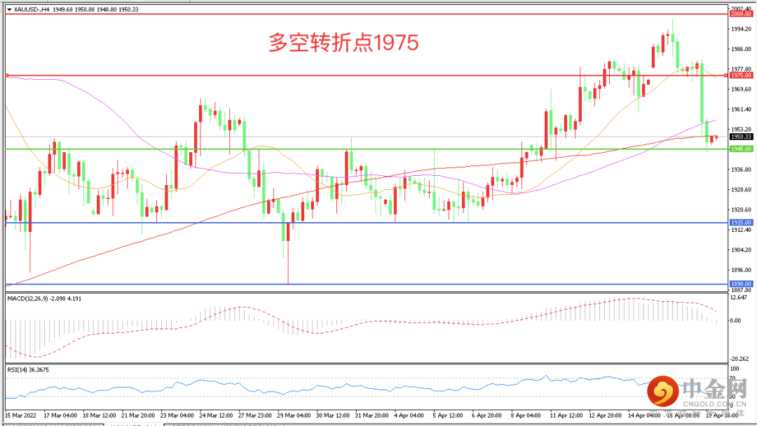 昨日,现货黄金美盘时段大幅下跌,盘中失守1950美元关口,较日高一度跌超30美元,收跌1.43%。本交易日亚市盘中,国际黄金走势震荡回落,延续周二跌势,金价早间开盘价格1949美元,最高涨至1951美元,最低跌至1939美元,价格短线波动偏弱。本周初黄金一度延续上周涨势,周一金价刷新最近一个月新高1998美元,不过在美联储激进加息预期的背景下,美债收益率持续走高,美元表现非常强势,这对黄金构成压力,打压金价回吐涨幅,周二美国实际利率转正,美股大涨,继续打压黄金下跌,金价跌势在日内延续,较本周最高点回落超过50美元。