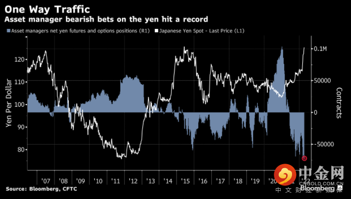 尽管日元跌势已经如此惨烈,但是空头仓位仍然高企。美国商品期货交易委员会(CFTC)的最新数据显示,资产管理公司上周将看跌日元的头寸推高至创纪录水平,与此同时,杠杆基金的净空头仓位仅略低于三年多来的最高水平。