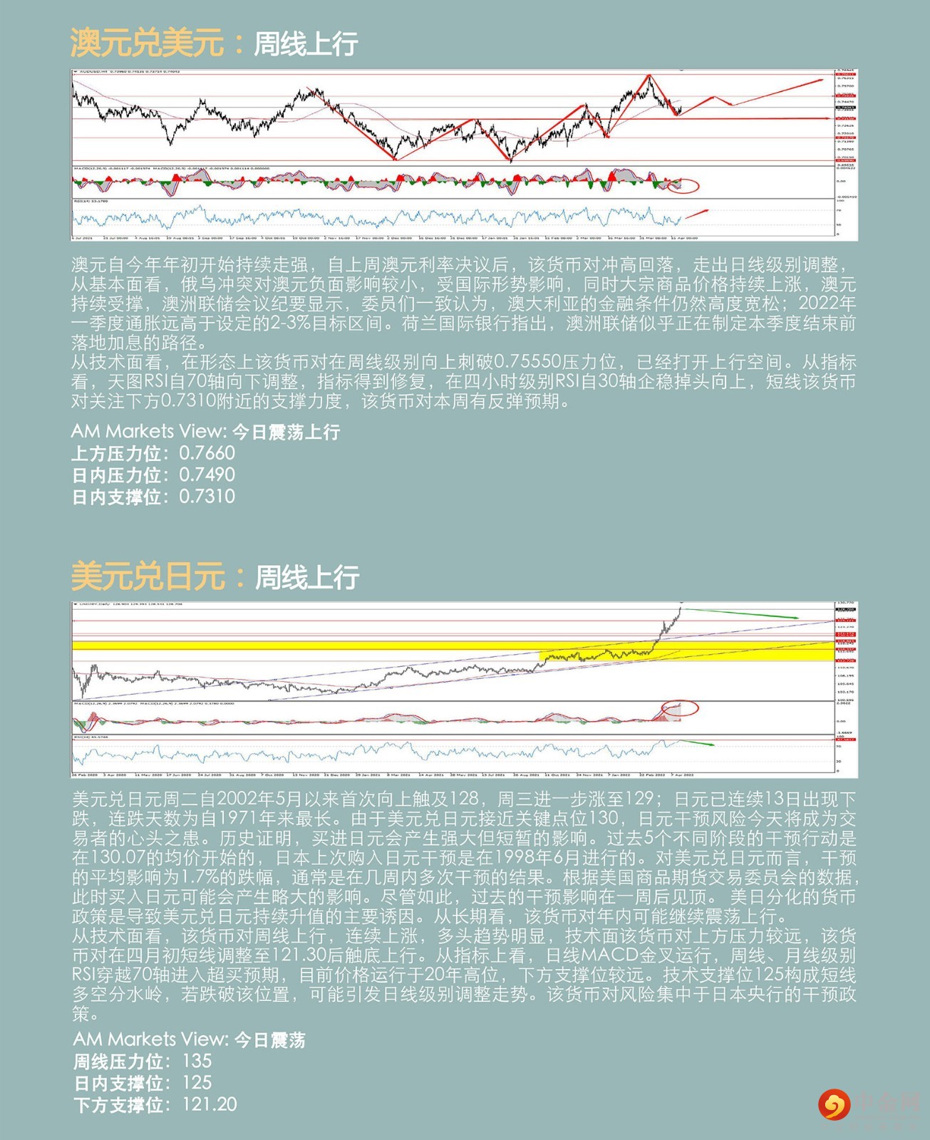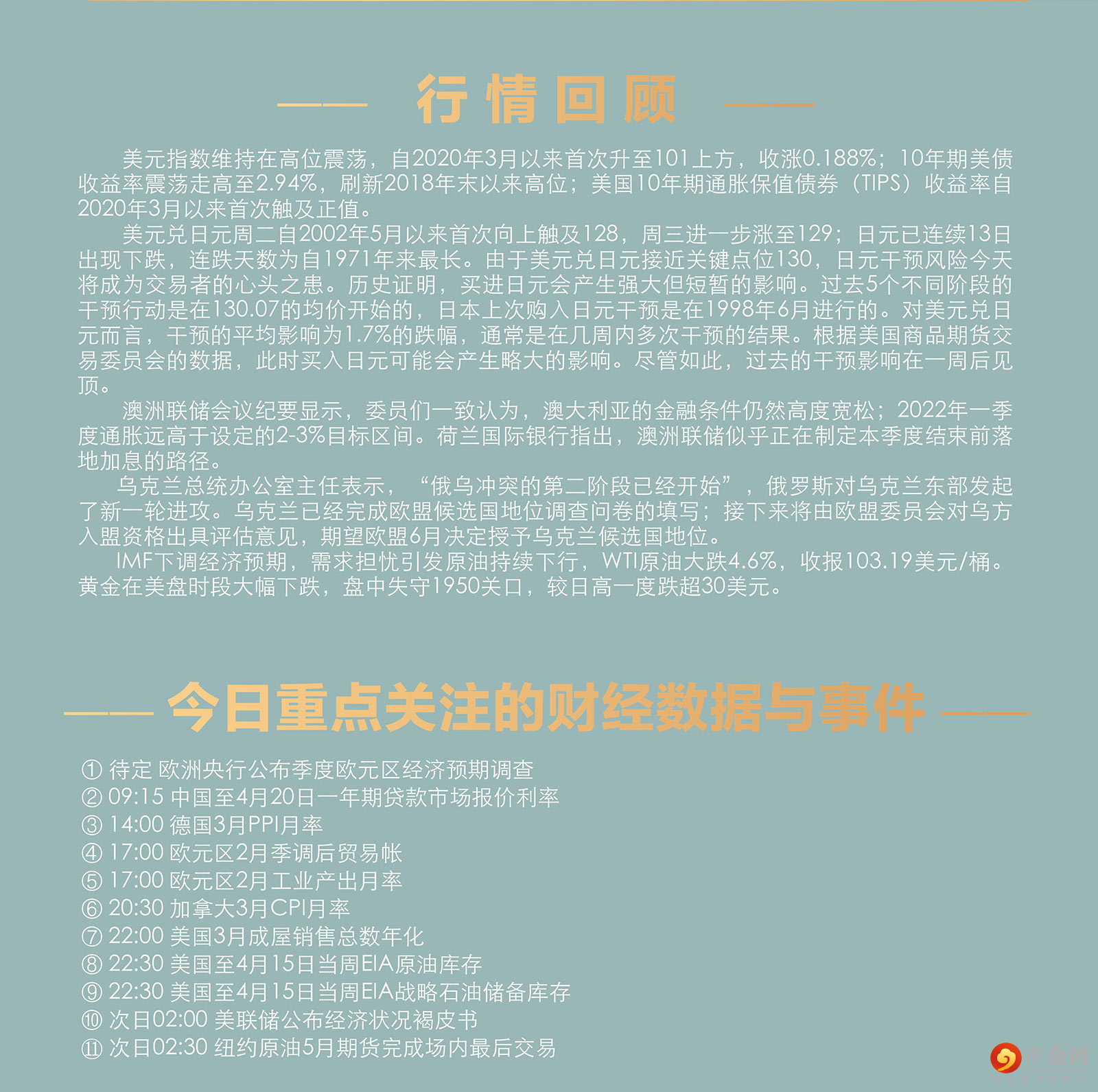 美元指数维持在高位震荡,自2020年3月以来首次升至101上方,收涨0.188%;10年期美债收益率震荡走高至2.94%,刷新2018年末以来高位;美国10年期通胀保值债券(TIPS)收益率自2020年3月以来首次触及正值。 美元兑日元周二自2002年5月以来首次向上触及128,周三进一步涨至129;日元已连续13日出现下跌,连跌天数为自1971年来最长。由于美元兑日元接近关键点位130,日元干预风险今天将成为交易者的心头之患。历史证明,买进日元会产生强大但短暂的影响。过去5个不同阶段的干预行动是在130.07的均价开始的,日本上次购入日元干预是在1998年6月进行的。对美元兑日元而言,干预的平均影响为1.7%的跌幅,通常是在几周内多次干预的结果。根据美国商品期货交易委员会的数据,此时买入日元可能会产生略大的影响。尽管如此,过去的干预影响在一周后见顶。 澳洲联储会议纪要显示,委员们一致认为,澳大利亚的金融条件仍然高度宽松;2022年一季度通胀远高于设定的2-3%目标区间。荷兰国际银行指出,澳洲联储似乎正在制定本季度结束前落地加息的路径。 乌克兰总统办公室主任表示,“俄乌冲突的第二阶段