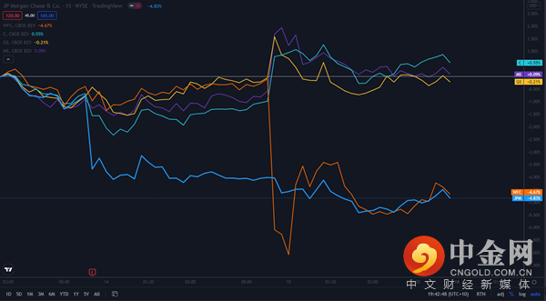 美国5家已经公布财报的银行股价一览,其中蓝色为摩根大通、橙色为富国银行、浅蓝色为花旗银行、黄色为高盛、紫色为摩根士丹利。
