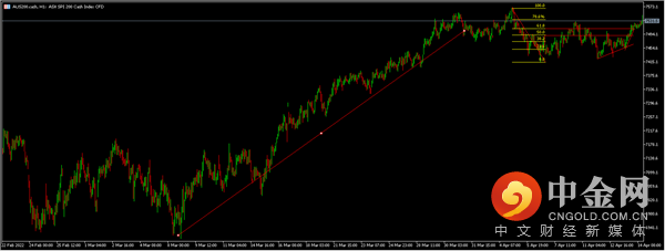 澳洲股指(AUS200)1小时图,该股指在3月8日至4月8日间,已经录得了9.40%的涨幅。