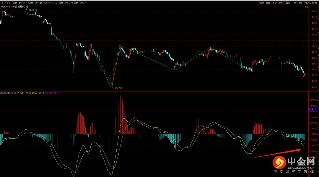 沪深300三十分钟出现向下的脱离段,目前需要观察脱离的力度,如果并没有出现大幅度脱离就有望出现背驰段,届时有望出现再次的反弹。注意4196点压制。在无法出现突破之前大概率不会有大的反弹空间出现。