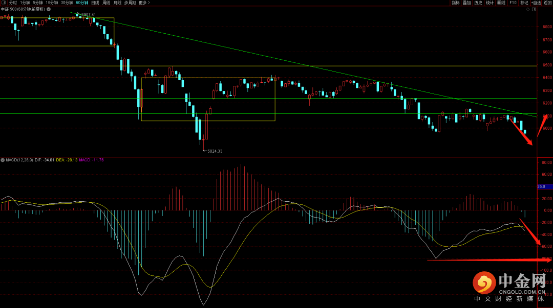 中证500短期如果继续向下大概率会有六十分钟的背驰反弹,但目前整体还处在六十分钟的下降趋势里面,在没有出现转折点之前大概率是无法有新的上升。关注后续行情是否能够突破下降趋势线,在没有突破之前大概率还会维持震荡下行走势。