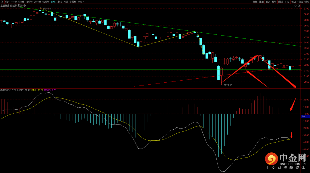 大盘低开向下后出现向下抉择,短期已经跌破了前期的颈线位大概率会出现向下调整走势,关注日线macd量柱是否转绿,一旦转绿则短期的反弹需要注意做高抛了结,大概率会出现震荡寻底的走势。