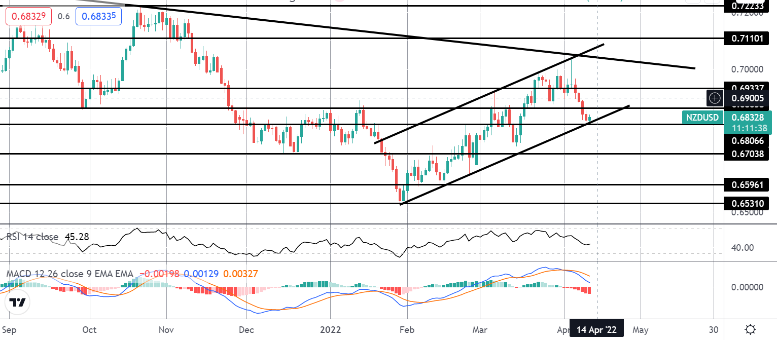 过去两周风险偏好的回落给纽元带来了沉重压力。随着美联储看起来越来越鹰派,今天强于预期的 CPI 数据可能会成为打破牛市通道的动力。由于零售市场的多头头寸超过 70%,这里还有很大的进一步下跌空间,空头可以寻求突破 0.6806 水平,最初目标是 0.6703,之后是 0.6596。