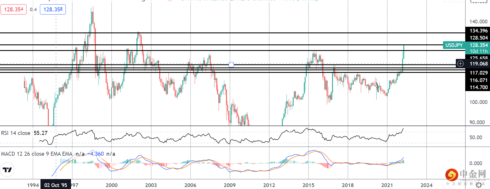 查看月线图上的美元兑日元,确实可以透视当前的走势。价格已突破 125.65 水平,目前正在测试 128.50 水平。由于散户市场大量做空且 MACD 和 RSI 都做多,重点是继续走高,134.39(2002 年高点)是多头需要注意的下一个重要标志。