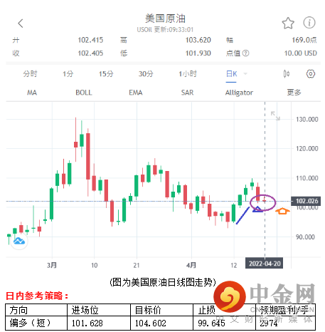 周二美油一度走高,其后震荡下行与跌幅扩大,最高来到108.305美元/桶,最低来到101.525美元/桶,下跌5.41%,收102.405美元/桶。