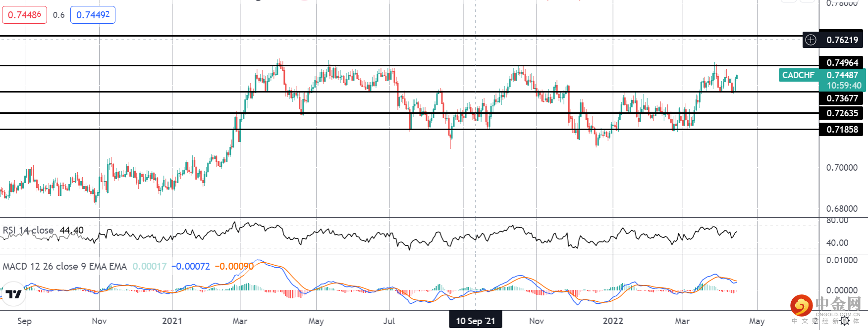 加元的鹰派预期和较高的油价在这里支撑着加元。由于央行本周加息 0.5%,并暗示将进一步加息,其与瑞士央行之间存在明显分歧,瑞士央行继续维持宽松立场。考虑到这一点,CADCHF 仍有足够的空间进一步上涨,特别是如果油价在短期内仍受到支撑。