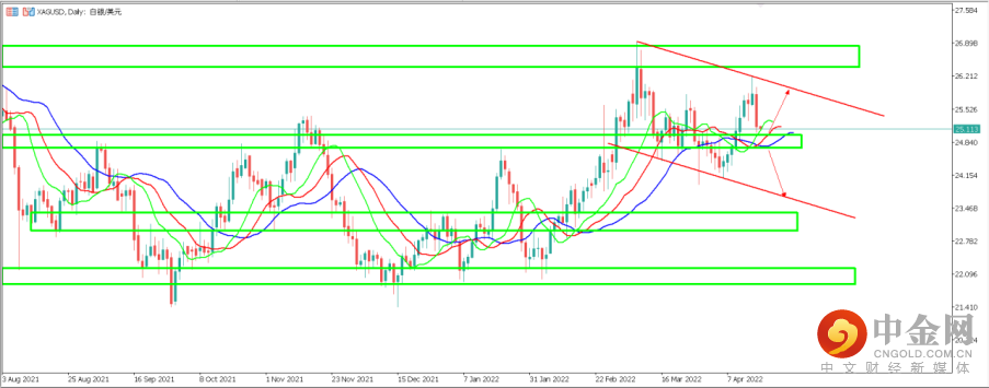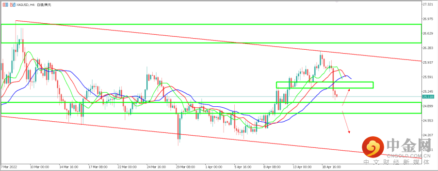 3. XAGUSD(白银兑美元):白银这边昨天出现比较大幅下跌,盘中最低价触及25.04美元附近。从天图周期来看,目前鳄鱼指标开始向下弯曲,价格有回落之势,价格暂时运行于鳄鱼指标之上。天图重要支撑区间位于24.80附近,这也是鳄鱼指标慢线位置具有一定支撑作用。如价格能在此企稳,有望继续上行至前高26美元附近区间。反之如价格下跌至支撑区间以及鳄鱼指标慢线之下,则价格大概率朝23.70一线运行。4小时周期来看,白银昨晚大幅度下跌终结了之前4小时上涨趋势,短期价格如果在24.80附近得到支撑有望反弹测试25. 40一线阻力支撑互换区间。如价格下跌力度大有效跌破24.80一线,则可能继续朝24. 20一线运行。目前价格正位于25.11一线附近运行。