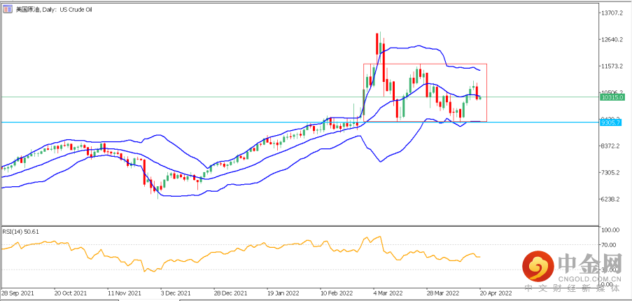 4. US Oil(美国原油):美油昨日超跌5%,目前总体结构价格位于日图93.00-116.50区间盘整,但每次上涨的高点都逐步低于前期,由此可见技术面上美油短期还是存在一定的上行压力。目前看涨美油的投资者请注意,价格只有有效突破盘整区间上沿116.50附近后,看涨动能才会进一步扩大,再次挑战120.00上方。