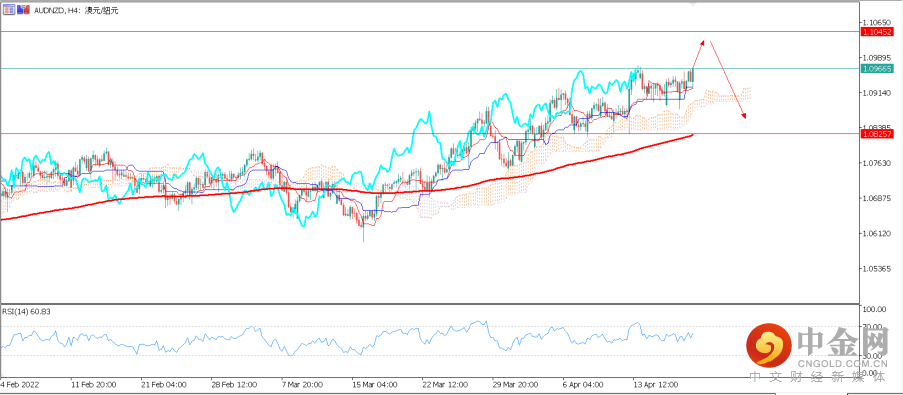 技术面来看,4小时图上显示AUDNZD在4月13日至4月19日展开了一段时间的高位盘整,最终汇价1.00865-1.09000的支撑区间,整体K线排列呈现看涨的形态。在没有突发基本面利空因素的影响下,料AUDNZD的多头将尝试冲击1.10450的压力位置。考虑到1.10450为2020年8月中旬的高点,预计空头或将在该压力位置附近伺机埋伏打压多头。