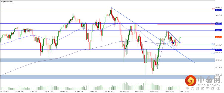 1. US30(道指):道指昨日大幅收阳上涨约386点,已经重新站上50日和200日均线。技术面日图可见,指数自3月8日在32360左右位置探底后展开反弹,并于3月30日在35380位置遇阻回调,经斐波那契回调线测量,回调幅度尚好,基本在38.2%-50%以上,同时也企稳在1月底始的下降趋势线上方。昨日的大阳线突破了该旗形整理区间,短期价格大概率将再测试35380位置,然后是2月9日高点35858与1月4日高点36800左右位置。反之,如果有利空因素,价格可能重新下探,跌破34022左右位置可以视为短期看涨失效。