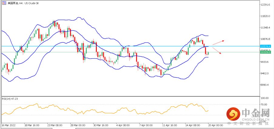 再结合4小时分图,日内关键多空分水岭位于布林带中轨105.70-106.00区间,若价格有效突破该位,则上方潜在分别为108.50及110.00附近。若日内价格下穿布林带中轨支撑,则将下探至99.00-100区间。