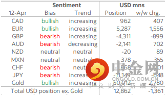 CFTC 截至周二的一周数据显示,美元看涨押注总额在 3 月下旬达到 12 周高点再次减少。我们涵盖的主要货币的总体头寸显示,继上周减少 22 亿美元后,美元净多头减少 14 亿美元至总计 129 亿美元。