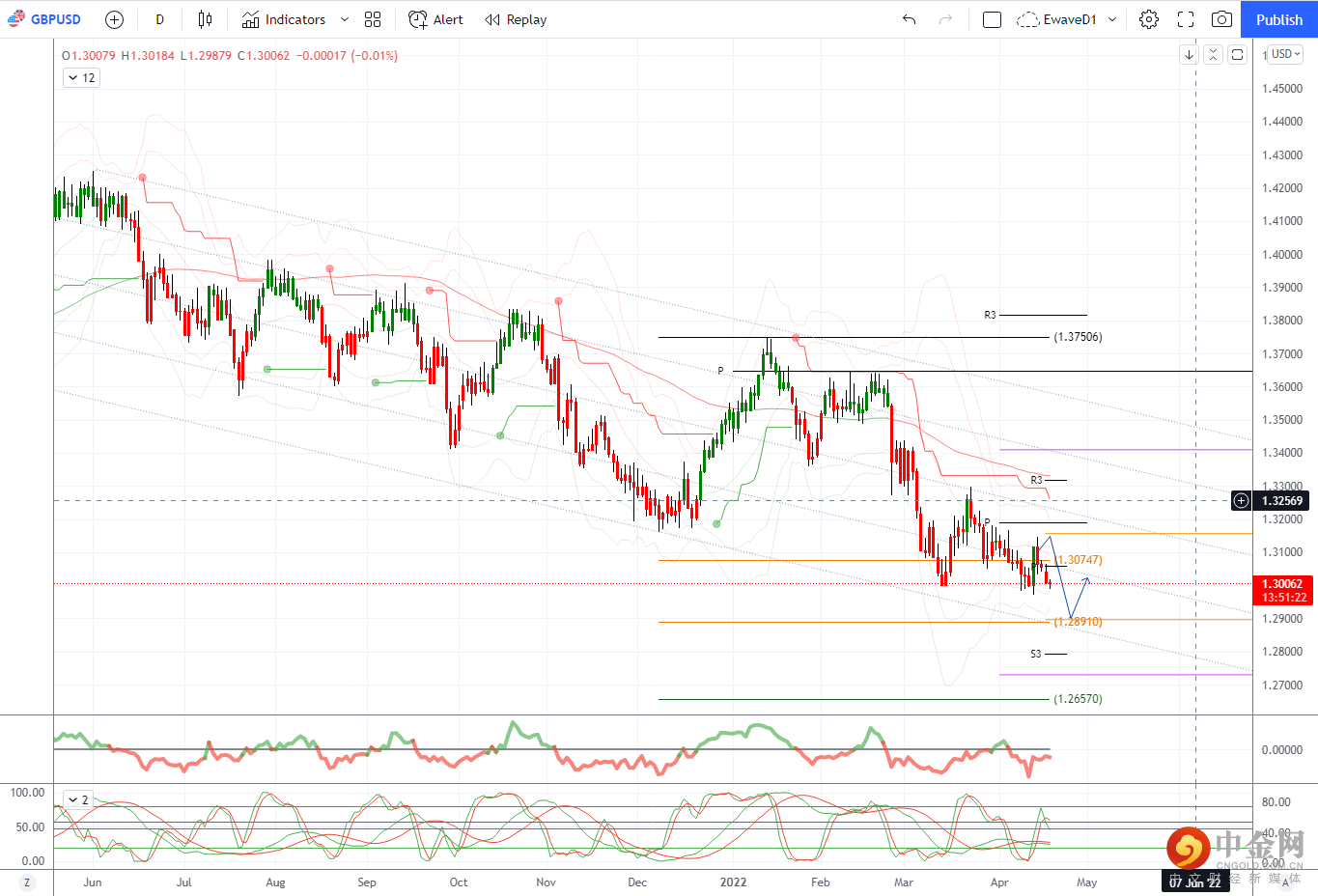 上周的 1.2973 2022 低点和 1.2962 低点 21 天波利波段第一支撑