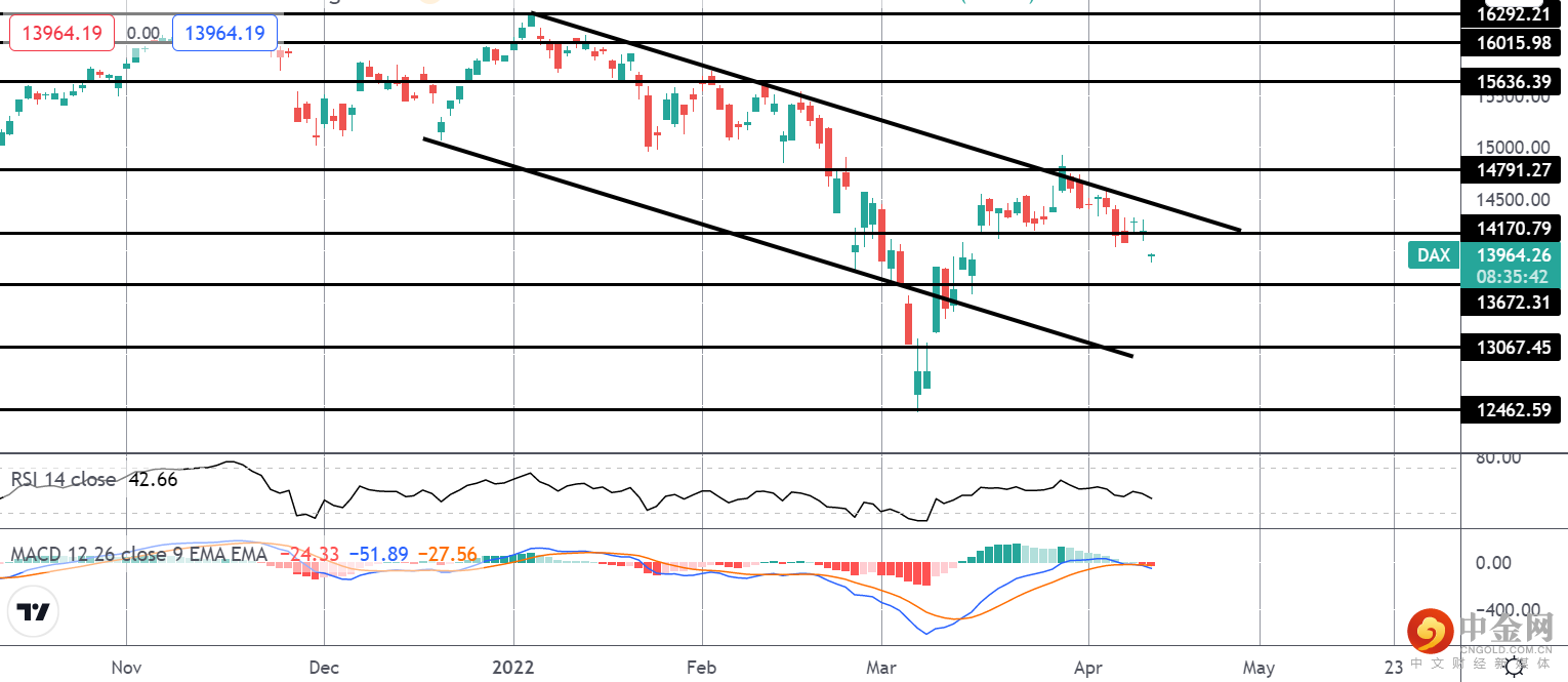 测试通道顶部和 14791.27 水平后,指数再次走低。价格现已跌破 14170.79 水平,MACD 和 RSI 均转低,接下来的焦点是测试 13672.31 水平。该区域的突破将对DAX造成严重看跌。