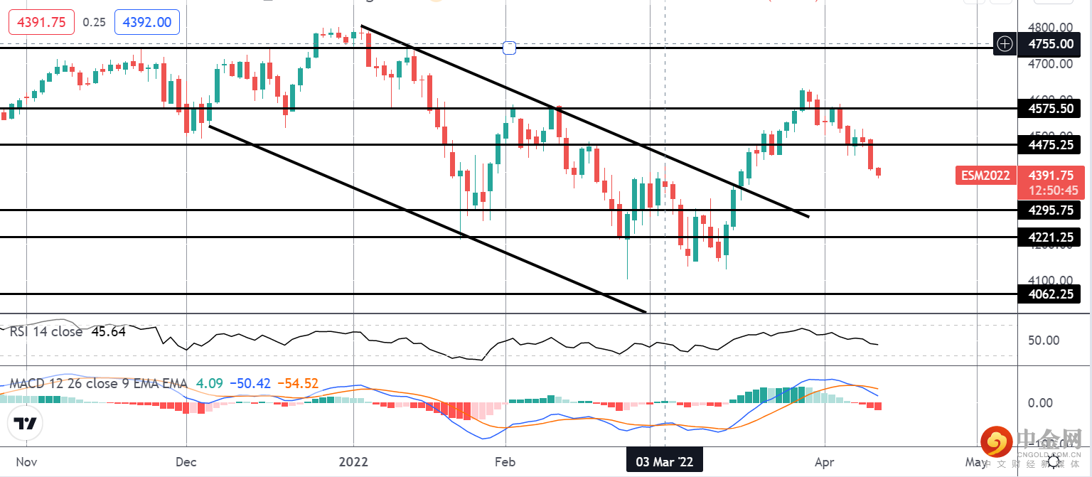 未能突破 4575.50 导致市场大幅下跌,价格现在轻松回到 4475.25 下方。 虽然在此下方,且 MACD 和 RSI 均转低,但焦点是接下来测试 4295.75 水平的更深支撑。