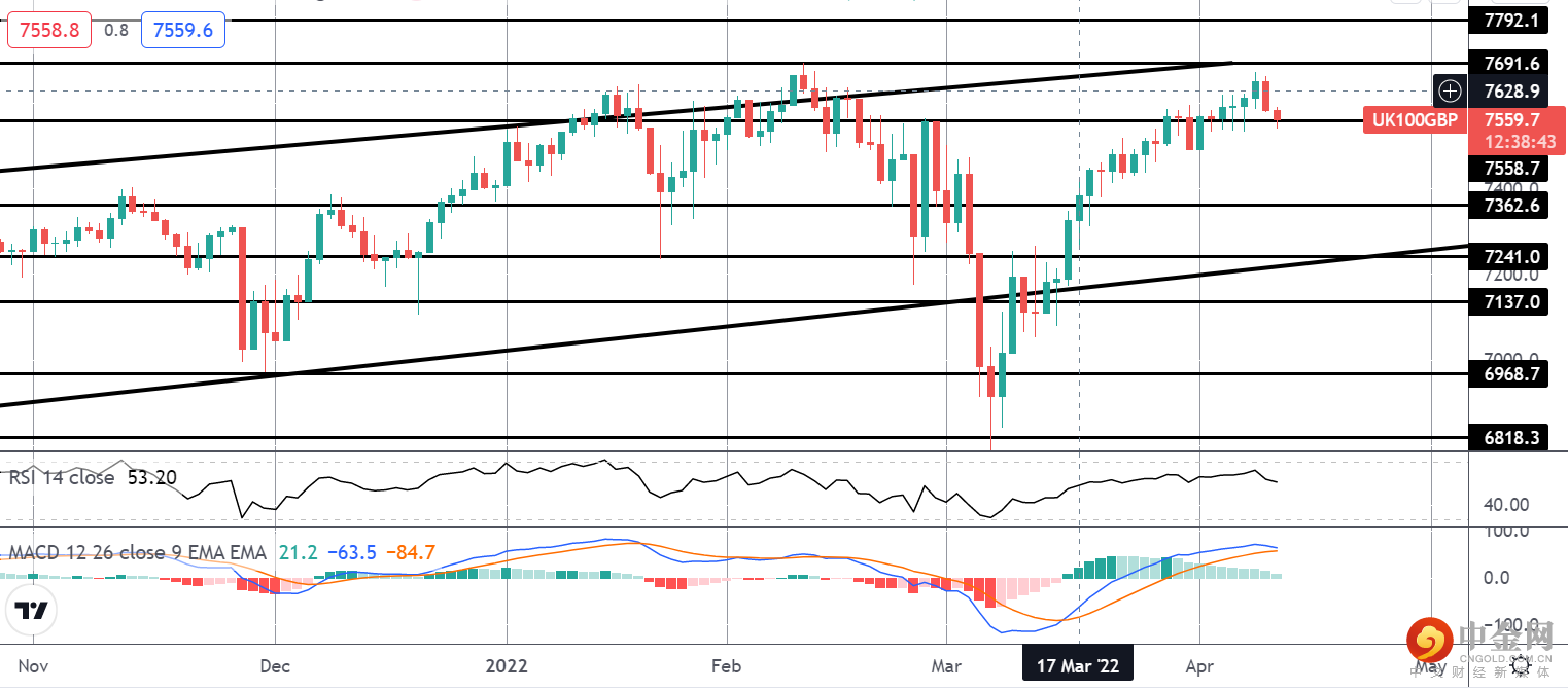 目前,富时指数继续保持在近期高点附近,受牛市通道顶部的限制。 价格目前位于 7558.7 支撑位,虽然 MACD 和 RSI 都开始走低,但该水平保持不变,重点是进一步上行和下破 7691.6。 不利的一面是,7362.6 是下一个需要注意的支撑位。