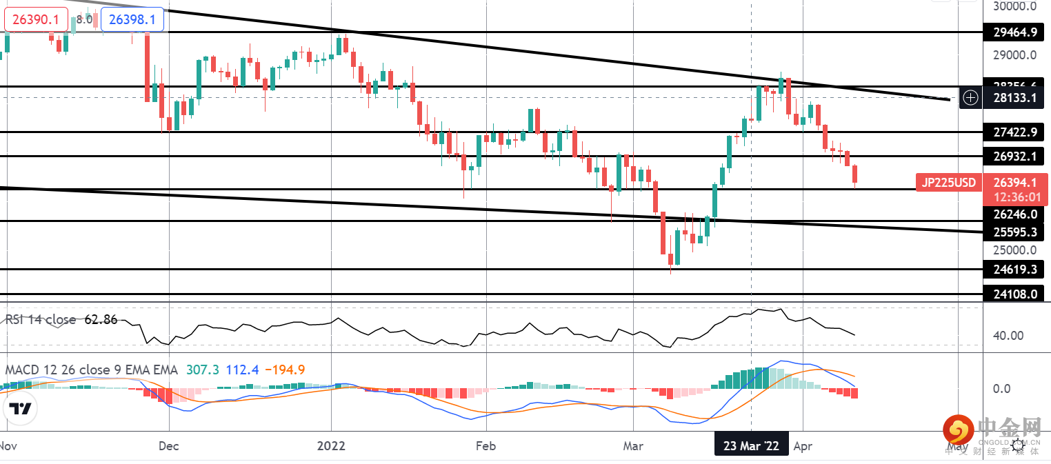 通道顶部和 28356.6 水平的失败导致市场坚定走低,日经指数现在测试 26246 水平的支撑。 由于 MADC 和 RSI 均看跌,重点是继续走低至通道低点和接下来的 25595.3。
