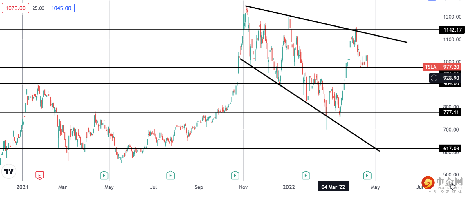 继 ATH 看跌趋势线的最新测试失败后,特斯拉目前位于 976.23 水平的支撑位。价格目前由一个大的、下降的、扩大的楔形构成,这表明近期有进一步走低的风险,下一个支撑位是 904。然而,该模式是纠正性的,意味着最终会继续走高。