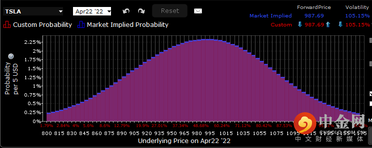盈透证券期权概率实验室对特斯拉将于2022年4月22日到期的期权的图表