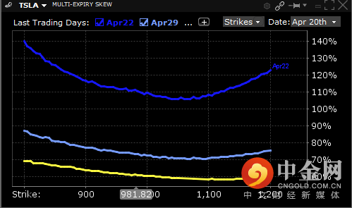 特斯拉期权多个日期的倾斜率,4月22日到期(深蓝色),4月29日到期(浅蓝色),5月20日到期(黄色)