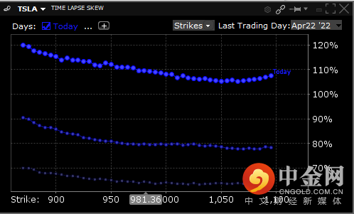 将于2022年4月22日到期的特斯拉期权的延时偏斜率,从上到下分别为4月20日,4月19日与4月18日。