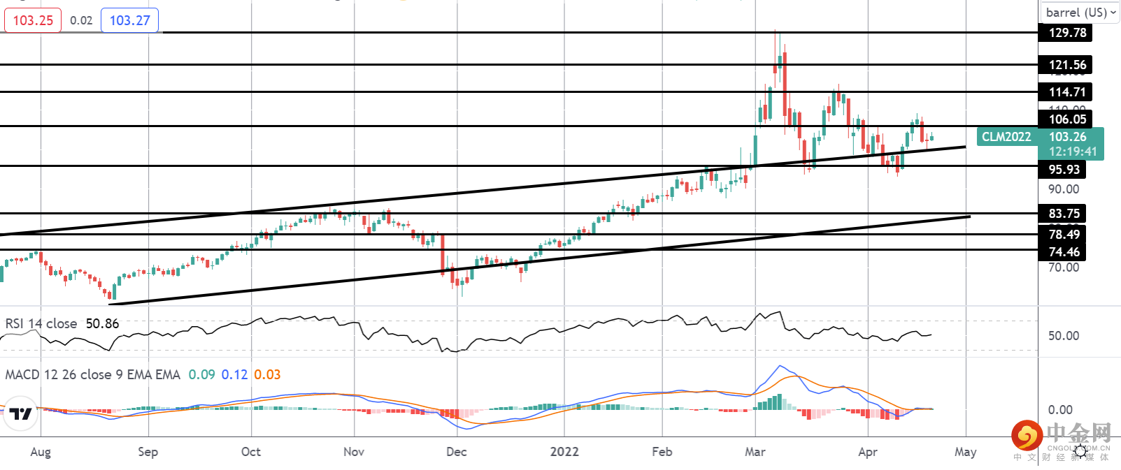 油价从 129.78 水平回调,市场在重新测试突破的牛市通道和 95.93 支撑区域附近找到稳固支撑。目前,该区域处于底部,虽然高于此处,但不能排除进一步上涨的可能性。然而,如果我们跌破 95.93 水平,焦点将转向更深的支撑位 83.75,通道低点就在下方。