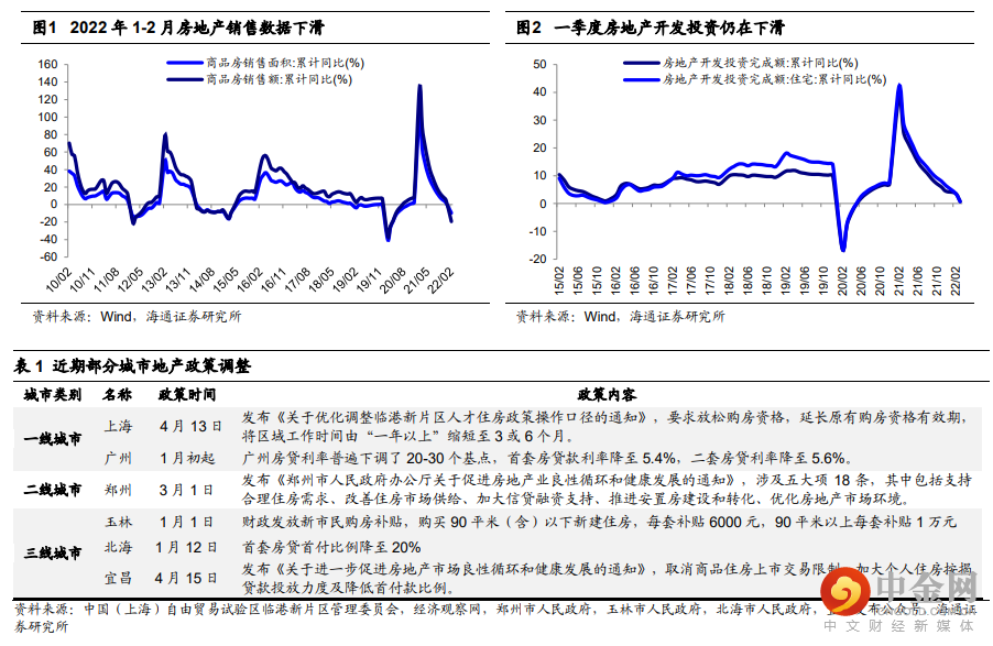 一季度地产投资企稳,政策放松下全年有望维持合理区间运行。最新公布的数据显示,22年一季度房地产投资房地产开发投资完成额为27765亿元,同比增长0.7%。虽然目前地产基本面数据仍不佳,2022年1-2月商品房销售面积和销售额同比下降为9.6%和19.3%,但随着各地利好房地产政策不断推出,销量有望得到改善。据海通地产组预测,乐观情景下22年施工增速在1.4%,对应投资增速有望达2.7%,全年销售金额增速为-2.7%。