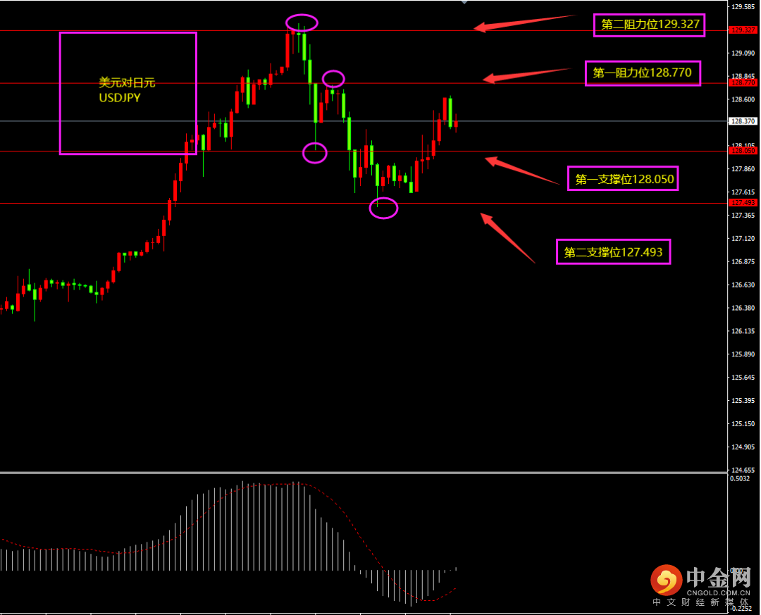 天图英镑收大阳线,价格大幅冲高,多头形成筑底,短期底部自底背离之后,多头有所增强,空头持续减弱,日内更多以逢低看多为主?小时图英镑期间连续阳线拉升,MACD位于0轴之上,多头占优,短期上方虽有连续阴线回落,但更多视为调整,调整之后有望继续冲高。
