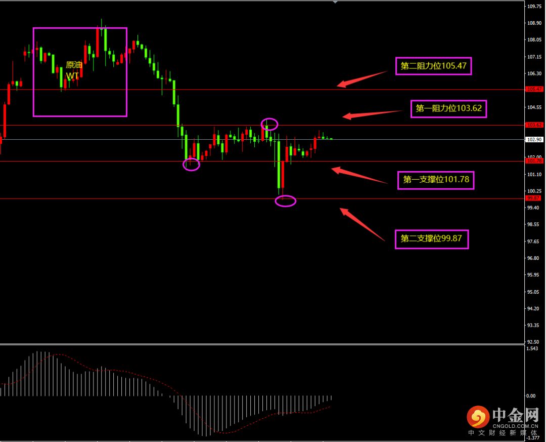 天图黄金收小阳线,价格小幅冲高,多头有所增强,短期MACD仍位于0轴之上,多头仍在,随着短期底部维稳,日内更多以逢低看多为主。小时图黄金期间连续两轮阳线拉升,多头有所增强,短期MACD上移至0轴附近,空头减弱,日内更多以震荡以及震荡上行为主。