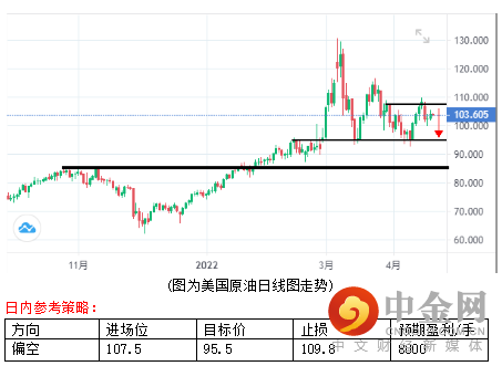 周四美油震荡拉升,从最低102.010美元/桶,最高来到105.410美元/桶,上收104.035美元/桶。