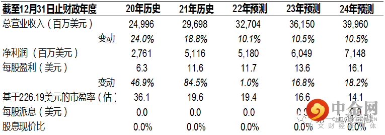 下调2022-2024年收入至327/362/400亿美元,同比增长10%/11%/11%;经营利润率21.0%/21.8%/23.1%;净利率16%/17%/18%。采用DCF法估值(WACC 9.1%,长期增长率3%),求得目标价482.10美元,较当前股价有113.14%的上升空间,维持买入评级。